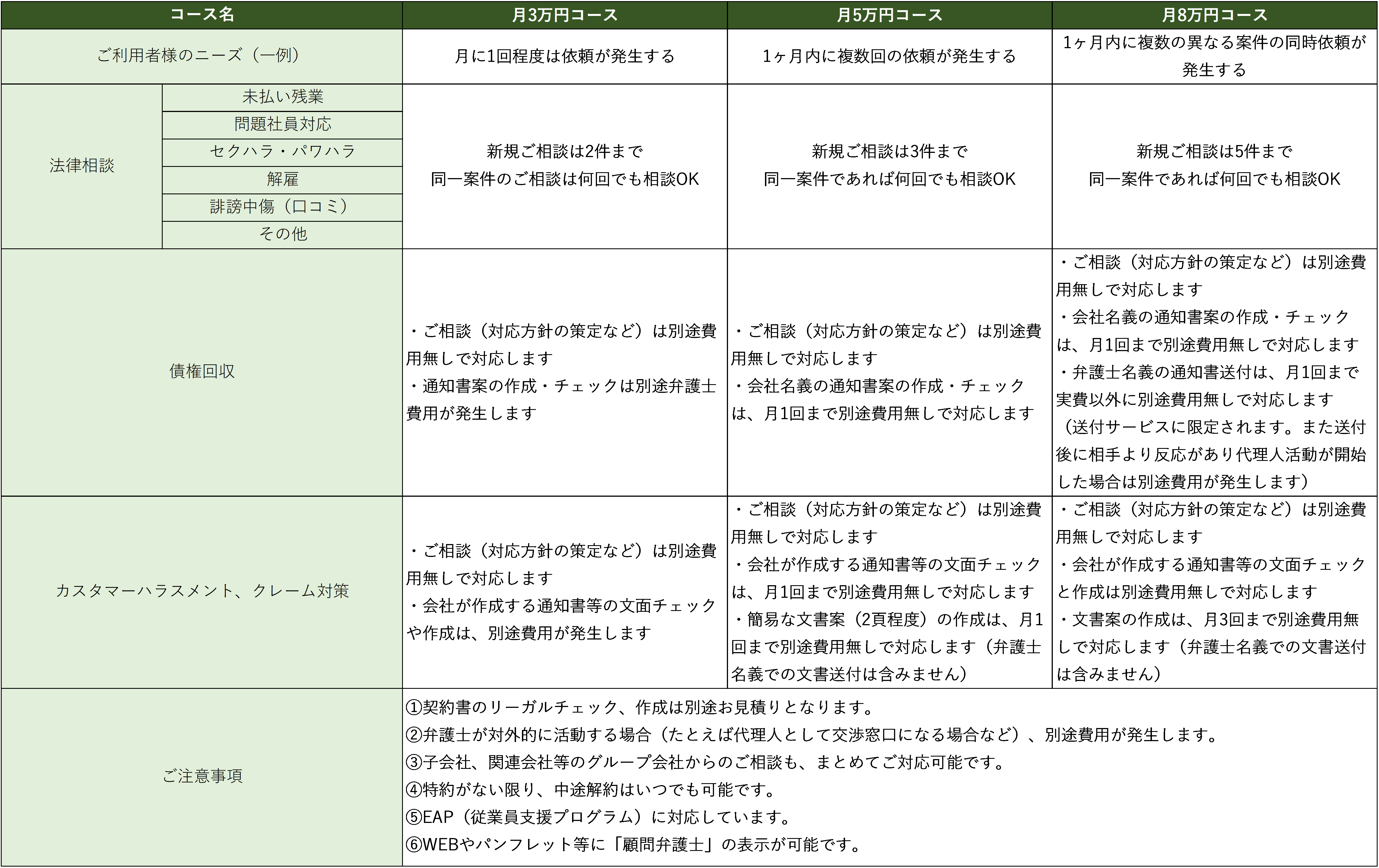 毎月定額料金にて、業務を遂行する上での経営課題(例えば、顧客とトラブルになりかけているので先手を打って対処しておきたい、問題社員への対処法につき事前に方針を決めておきたいなど)に関するご相談への回答を行うこと、取引先から提示された契約書等のリーガルチェックを行うこと、その他業界動向に応じた情報提供と改善策のご提案を行うことなどが中心となる法務サービスとなります。